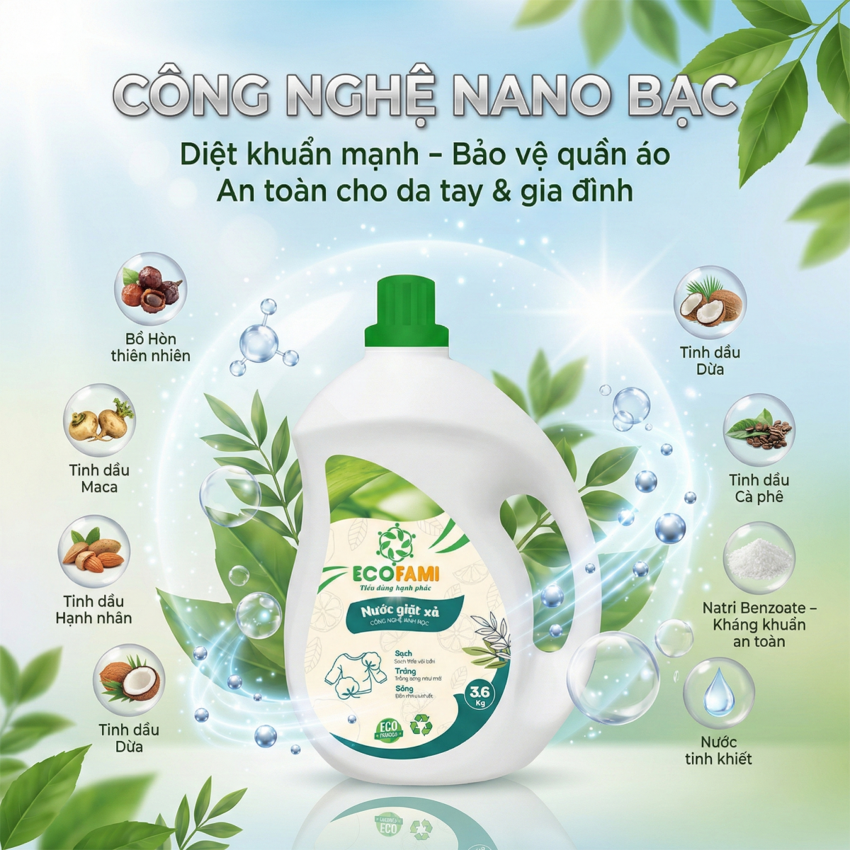 Sức mạnh của Ecofami không chỉ đến từ công nghệ cao, mà còn từ sự kết hợp tinh tế với các thành phần thiên nhiên lành tính. Chúng tôi tin rằng, một sản phẩm tốt phải an toàn cho cả người sử dụng và môi trường.