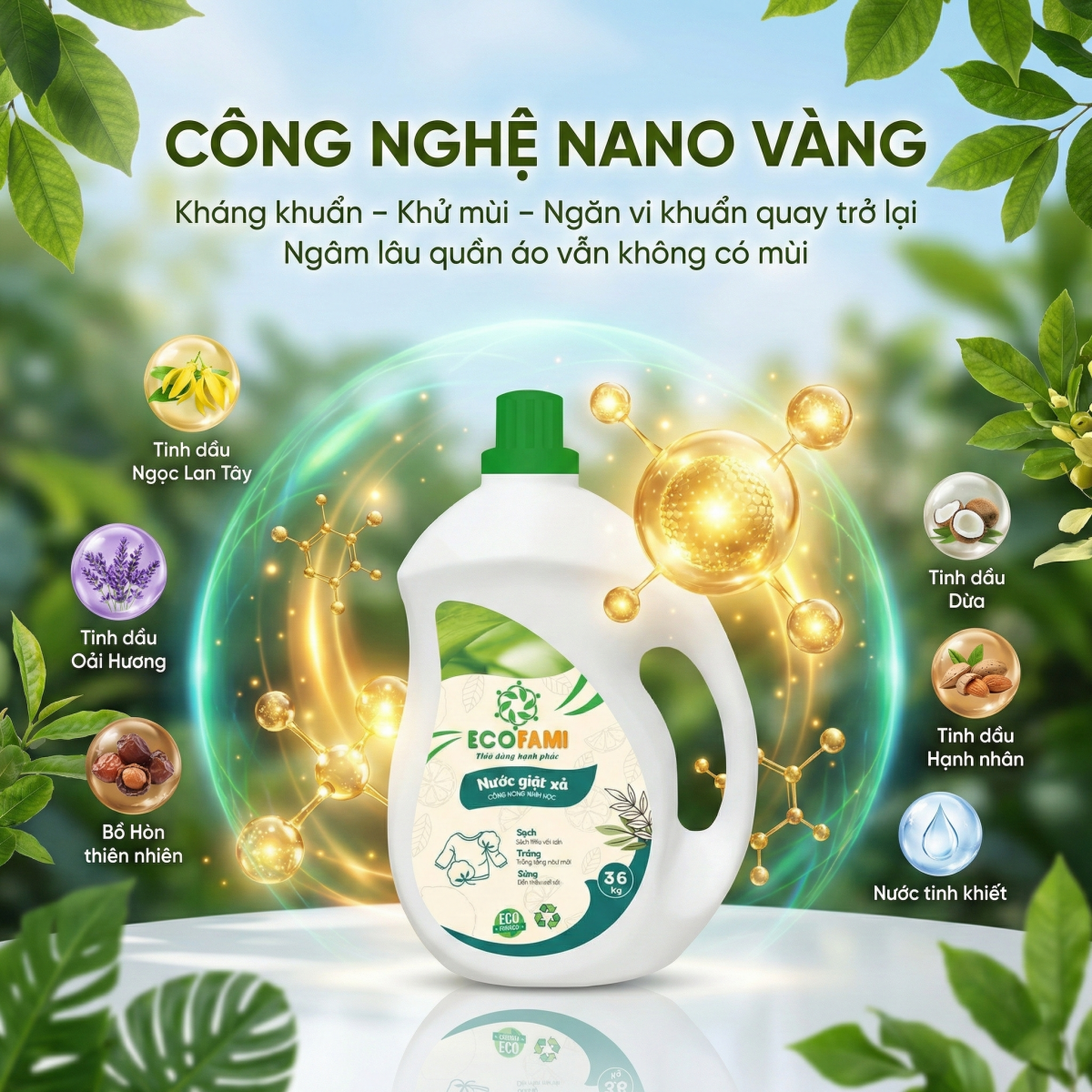 Sự hiện diện của Công nghệ Nano Vàng trong nước giặt Ecofami mang lại 3 lợi ích cốt lõi, giải quyết trực diện vấn đề hôi và nhớt: